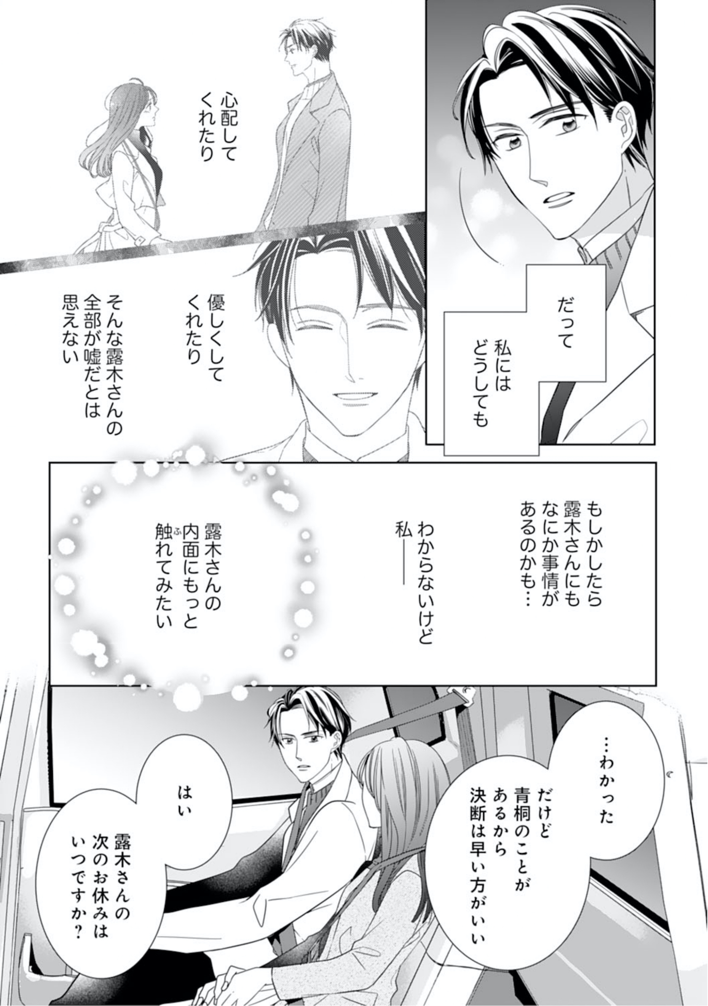 パイロットの元恋人に裏切られた過去から縁談を断るつもりだったが、待ち合わせの場で露木も結婚する気がないと知り、ひと安心する。