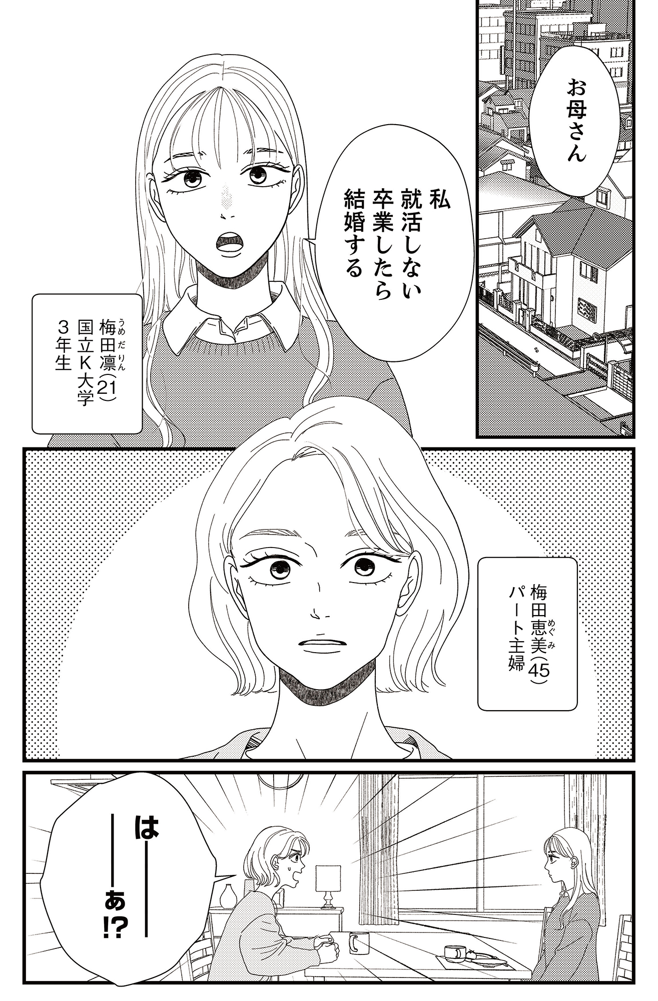 九州の地方都市で暮らす恵美は、大学3年生の娘・凛から「就活はせず、32歳の彼氏と卒業後に結婚する」と告げられ頭を抱える。