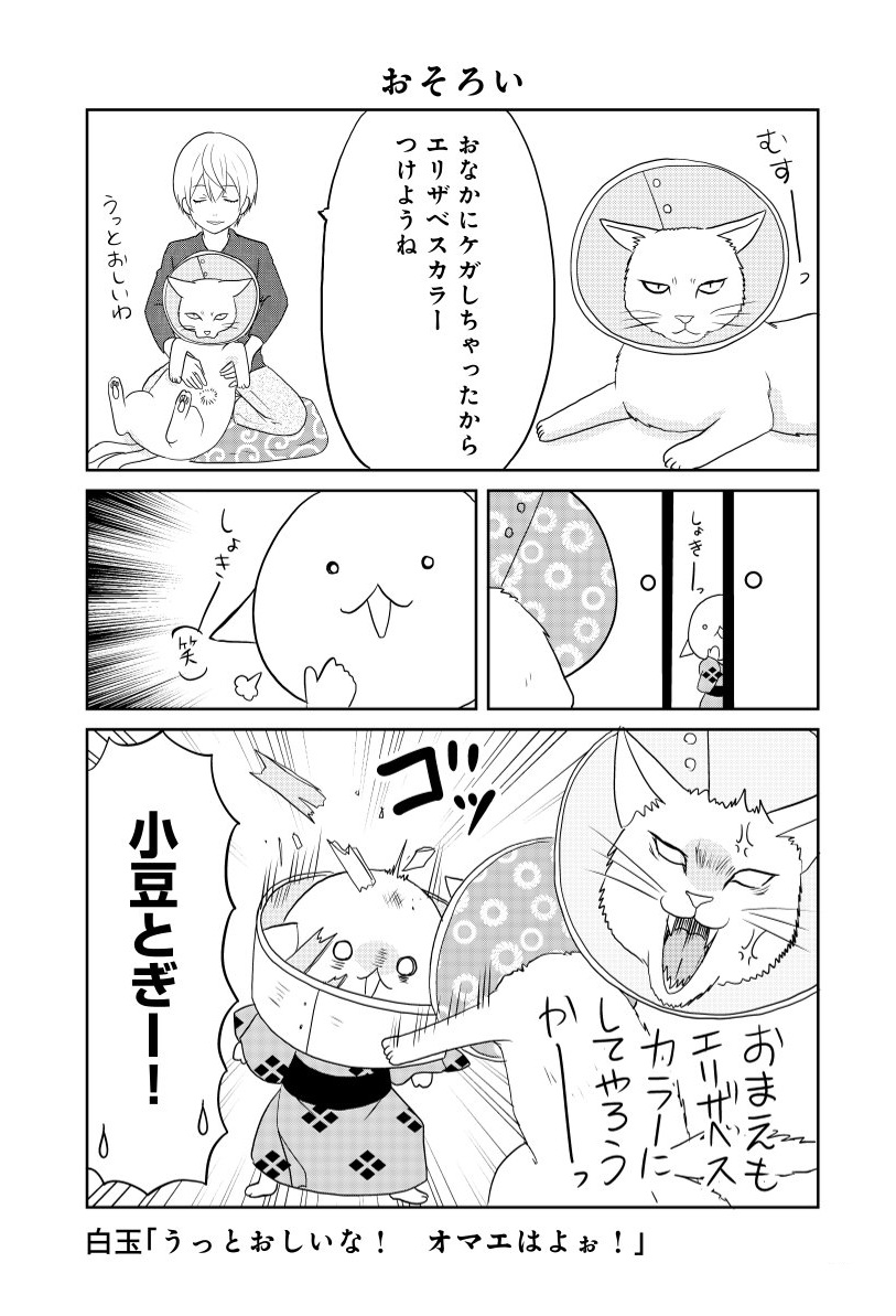 お腹をケガした「ねこまた」。エリザベスカラーをつけた姿を見た小豆とぎは…【ウチの百鬼夜行 #28】