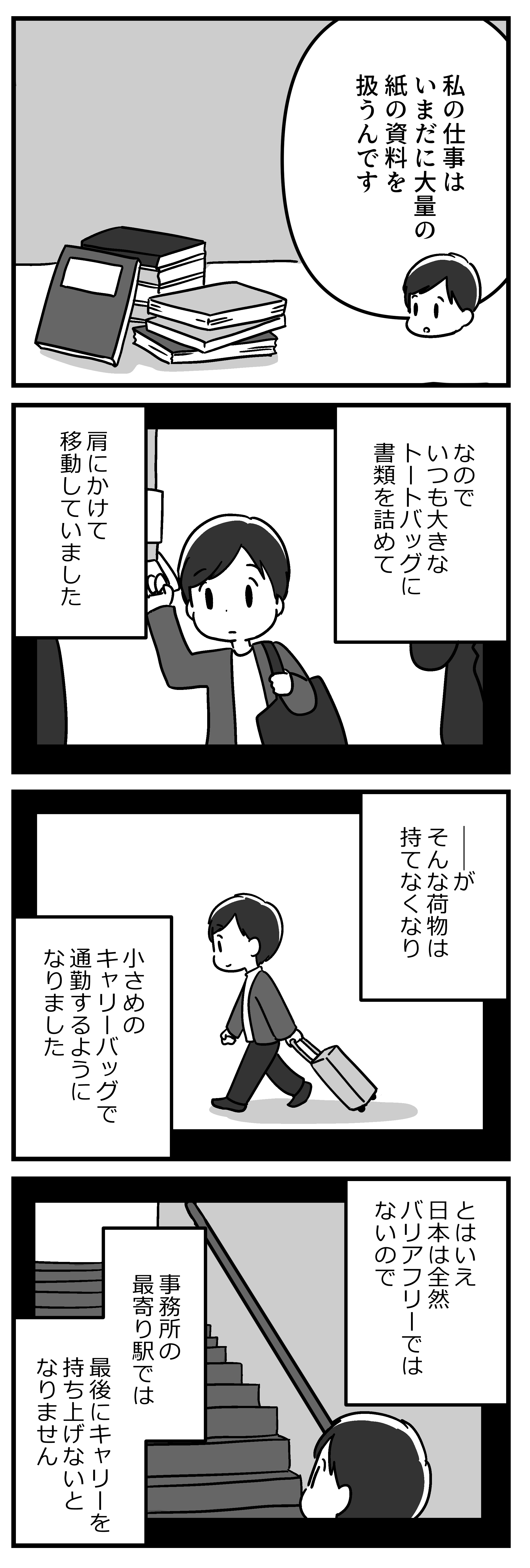 荷物も持てなくなってキャリーバッグで通勤。でも、階段を上るのが苦痛でストレスを感じるように…