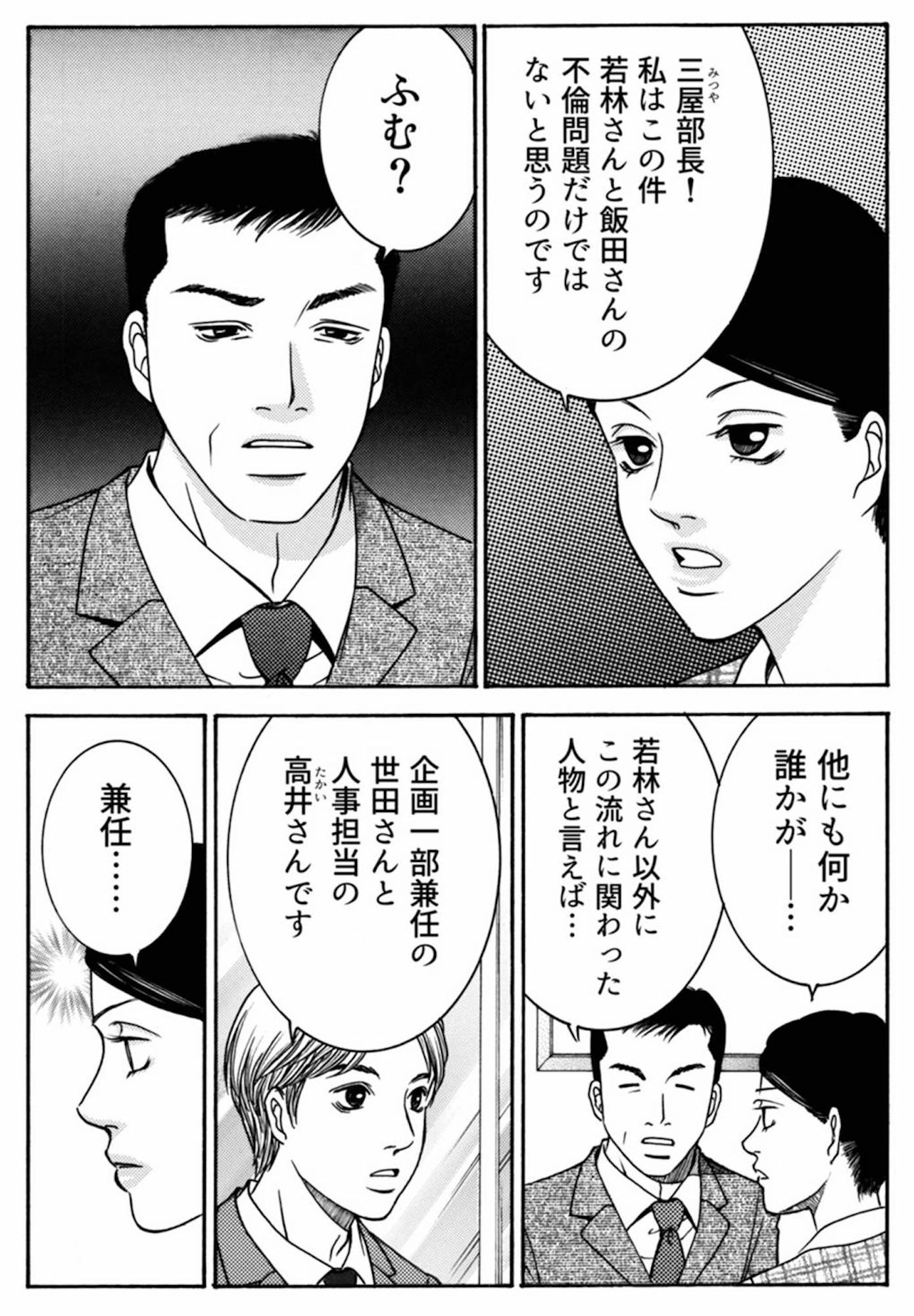 上司の不倫相手が昇格できたのは、社内評議をすっとばしたから? この件に関わった疑わしき人物とは…【社内探偵 #23】 2026.04.29 WORK マンガ試し読みマンガパワハラ社内探偵 試し読み不倫試し読み ▶Renta!『社内探偵』 ▶30日間無料▶ Amazonの読み放題をチェック! ▶【99円で2カ月間】 Audible が無制限で聴ける! ▶楽天KOBO 初回購入金額のポイント最大70倍! スポンサーリンク 次のページへ >> 1 2 3 この記事は OTONA SALONE1 【注目の記事】 「外に出られる気がする」引きこもりだった長女が動き始めるまで しっかり者だった娘が見せた「不登校のサイン」とは?子育てを学び直して気づいたこと 自分の高級時計は「即買い」するのに、子どもの塾代はケチる夫。「男の見栄」による経済DVで家庭が壊れるまでの顛末は 「親の将来や健康が不安になる…」。親世代の転ばぬ先の杖「Foot Fit 3 Compact」、今すぐ「使い慣れてもらう」べき理由 男性のモーニングエレクション低下は「重要な疾患につながるとても明らかなサイン」、軽視しないでほしい 【人気の関連記事】 女主人の夫に浮気の影を感じる…害虫を排除するため家政婦は‟ある行動”に出る!【家政婦クロミは腐った家族を許さない [hidefeedLN]#6[/hidefeedLN]】 閑静な高級住宅街の戸建てに住む4人家族。一見、裕福で理想的な家族だが、内情は問題だらけ!そこに現れたのは、美しく有能な家政婦・黒見白華。彼女が掲げる“理想の家族… 彼氏の誘いを断りパパ活を続行。ホテルを出た後、待ち伏せていたのは…【家政婦クロミは腐った家族を許さない [hidefeedLN]#10[/hidefeedLN]】 閑静な高級住宅街の戸建てに住む4人家族。一見、裕福で理想的な家族だが、内情は問題だらけ!そこに現れたのは、美しく有能な家政婦・黒見白華。彼女が掲げる“理想の家族… 「俺になんか隠してることない?」彼氏にパパ活がバレた!? 咄嗟にウソをついて誤魔化したものの…【家政婦クロミは腐った家族を許さない [hidefeedLN]#8[/hidefeedLN]】 閑静な高級住宅街の戸建てに住む4人家族。一見、裕福で理想的な家族だが、内情は問題だらけ!そこに現れたのは、美しく有能な家政婦・黒見白華。彼女が掲げる“理想の家族…
