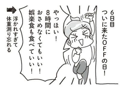 お待ちかねの「オフ」の日。あれもこれも食べちゃった…でも、翌日の体重はコーチの予言通りで…?!【アラフィフ母さんが7kg痩せた!奇跡の仕組みダイエ…