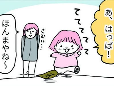 葉っぱをみつけて、駆け寄るわが子。遊ぶのかと思いきや、なんだか様子がおかしいぞ?【育児ってこんなに笑えるんや! #22】