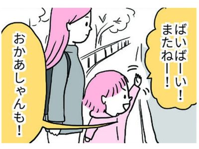 「ばいばーい!」と元気にお別れ。私も手をふるように促されたけど、その相手は…【育児ってこんなに笑えるんや! #23】