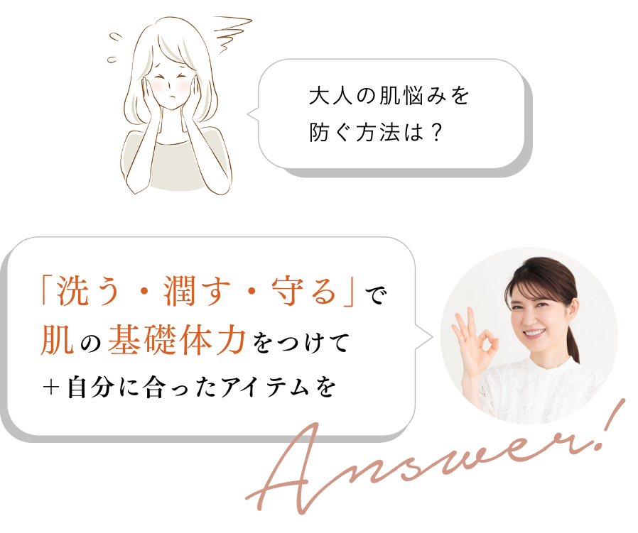 やはりまずは乾燥・摩擦・日焼けによる刺激を起こさないことを大前提とし、基本の「洗う・潤す・守る」を大切にすること。この3ステップで肌の基礎体力をつけましょう。