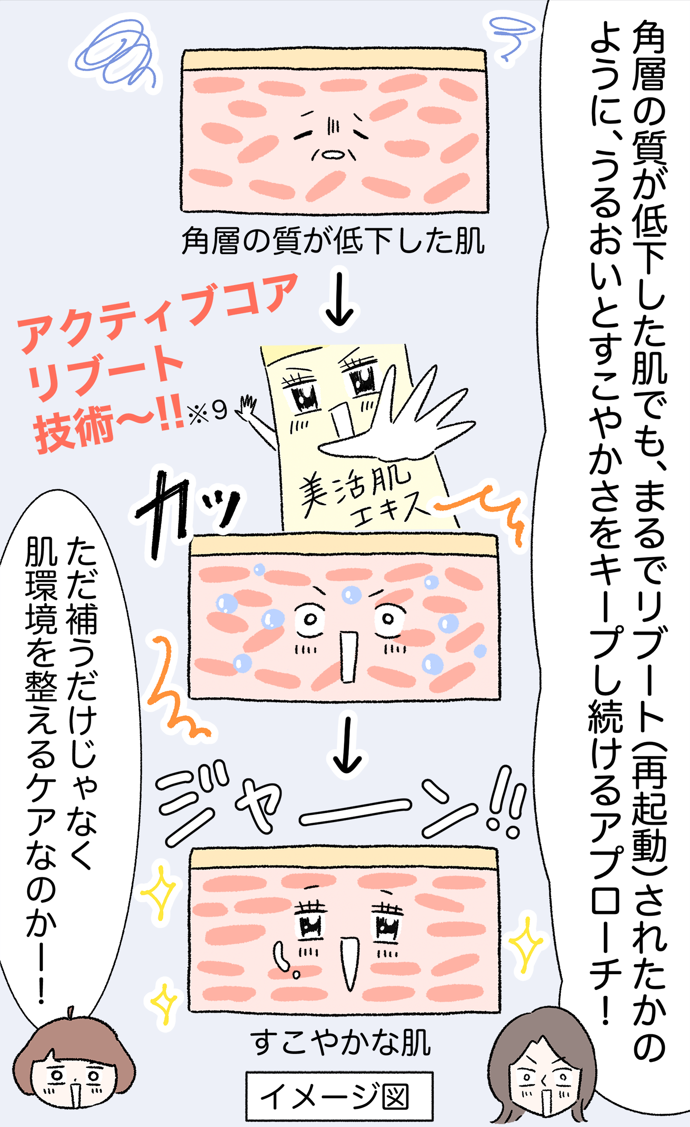 今回搭載した新技術「アクティブコアリブート技術※9」は、まるでリブート(再起動)されたようなうるおいとすこやかさをキープし続けるという技術で、「美活肌エキス」は、その手ごたえを最大限体験できるアイテムとなっています。