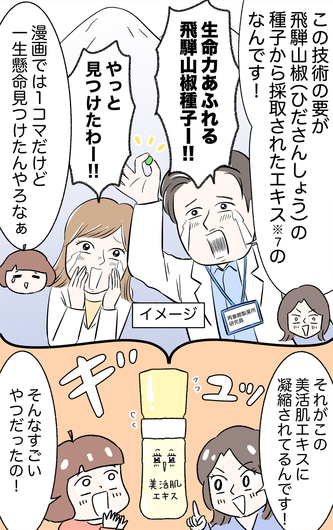 その技術を支えるのが、ミトコンドリア研究の中で見いだされた新たな植物原料「飛騨山椒種子」。500種類以上の植物サンプルから見つけ出した素材です。