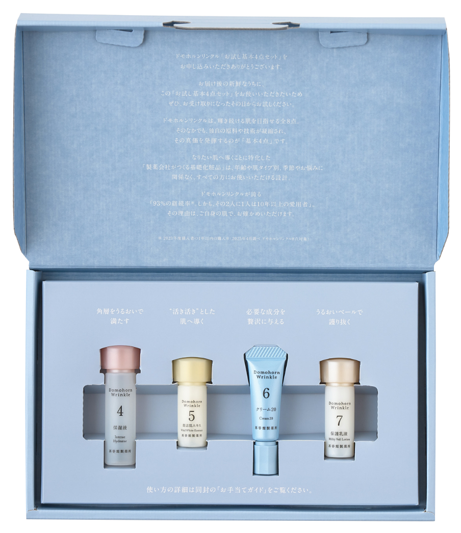 ※3 販売名:ドモホルンリンクル 薬用美容液c ※4 販売名:ドモホルンリンクル 薬用クリームd ※9 飛騨山椒種子エキス 医薬部外品表示名称:加水分解山椒種子抽出液 配合目的:肌をすこやかに保つ ※10 ブランド史上 ※11 医薬部外品表示名称:ヨクイニン・トチュウ葉・ラカンカ果実発酵エキス 配合目的:肌をすこやかに保つ