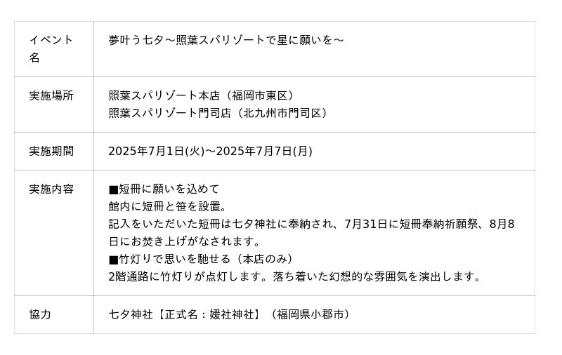 温浴複合施設「照葉スパリゾート」などを運営する株式会社ナカシロは、2025年7月1日(火)から7月7日(月)までの期間、「照葉スパリゾート本店」(福岡市)および「照葉スパリゾート門司店」(北九州市)にて、七夕神社(小郡市)協力のもと「夢叶う七夕~照葉スパリゾートで星に願いを~」を開催いたします。本イベントでは、夢を持つ皆様の目標の出発点となりますように、一人ひとりの大切な夢を応援します。