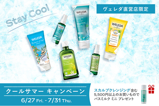 ヴェレダ直営店では、夏をすっきり爽やかにお過ごしいただくため、夏ケアにおすすめのアイテムをお買いあげの方にプレゼントを差し上げるキャンペーンを実施いたします。