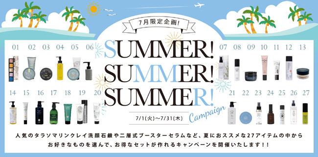 当社は毎年7月に対象商品から自由に組み合わせができる“Summer! Summer! Summer!“ を実施しています。首里石鹸の人気アイテム「ホワイトマリンクレイ洗顔石鹸」や「エッセンスハンドクリーム(薬用、酒かす)」をはじめ、今年販売を開始して大好評いただいている「タラソマリンクレイ洗顔石鹸」や「ホワイトソルトボディスクラブ」など、全27種類からお選びいただけるこの時期だけのスペシャルなキャンペーンとなっております。また今年の“Summer! Summer! Summer!“ では、「二層式ブースターセラム Garden」※1も選ぶことができます。