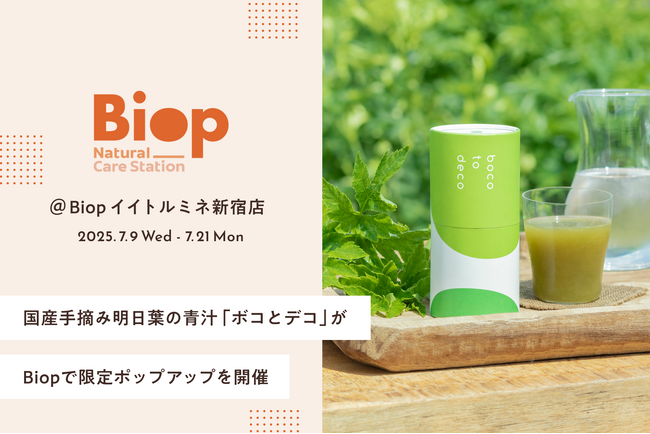 健康食品・化粧品の通販ブランド「ていねい通販」(本社:大阪市西区靭本町、代表取締役:古賀 淳一)が製造・販売する、たった2つの素材でつくる正直な青汁「ボコとデコ」は、2025年7月9日(水)~7月21日(月)の期間、オーガニック&ナチュラルコンビニエンスストア「Biop(ビオップ)」にて限定ポップアップを開催いたします。期間中は試飲も提供する予定です。