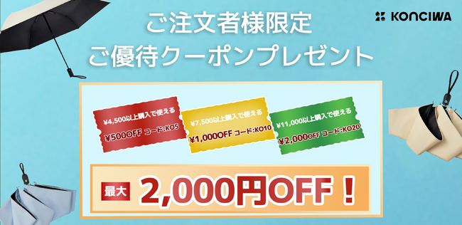 KONCIWAでは、公式オンラインストアにて割引キャンペーンを実施いたします。紫外線対策と突然の雨、どちらにも対応できる晴雨兼用傘を、今だけの特別価格でご提供。使いやすいクーポンコードで、日常使いに最適な1本をお得に手に入れていただけます。