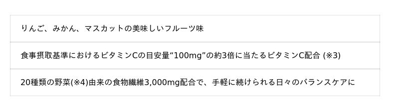 (※3)ビタミンCは、食事からの摂取を基本とし、バランスの取れた食生活の補助としてご利用ください。(※4)きゅうり,セロリ,リク,エンドウ,キャベツ,ほうれん草,レタス,ブロッコリー,トマト,赤ピーマン,オレンジ人参,キクイモ,黄色カボチャ,黄色人参,かぼちゃ,ビーツ,テンサイ,黒人参,玉ねぎ,パースニップ
