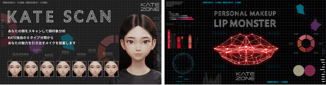 「KATE SCAN」は、『KATE ZONE』内の実験室=「LAB」エリアに設置された、顔印象分析コンテンツです。今回のリニューアルでは、アイブロウとリップ分析を新たに搭載し、これまで以上に没入できるコンテンツが広がりました。また、ユーザーがアイメイクやリップに取り入れたい色を選択できる機能を追加。その後、スマートフォンのカメラで顔をスキャンすることで、KATE独自のパーツ比率・顔印象分析から、あなたの魅力を引き出すメイクを提案します。
