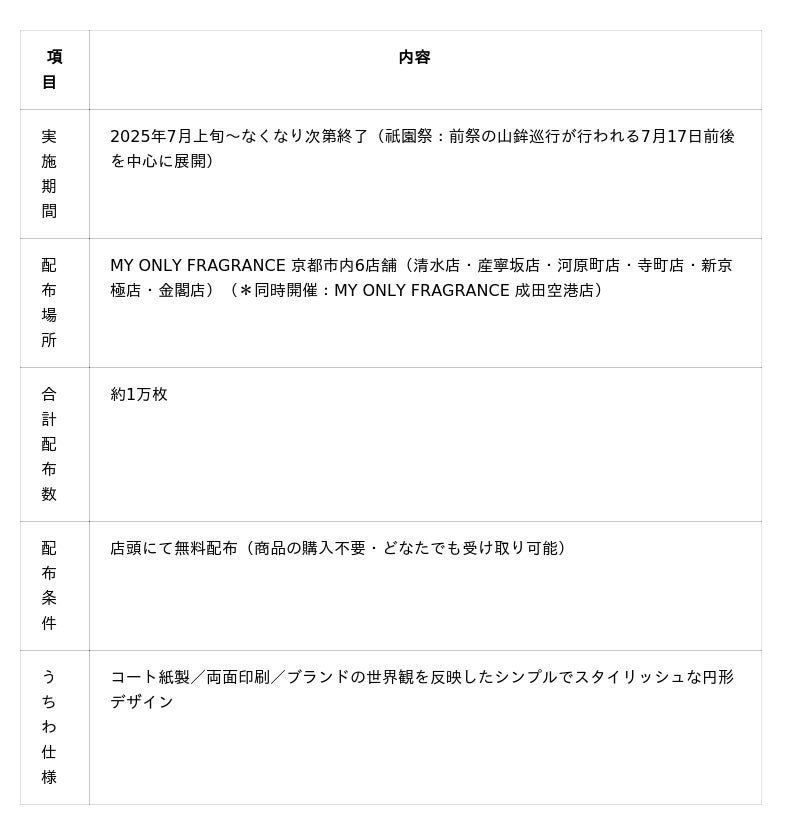 本企画は、京都の夏の風物詩・祇園祭に合わせて実施する、国内外の観光客の方々に向けた期間限定のプロモーション企画です。日本らしい「うちわ」というアイテムに、オーダーメイドで調合した香りを自由にまとうことで、「香りを選ぶ・まとう・重ねる」というMY ONLY FRAGRANCEならではの体験を、より気軽に楽しんでいただけます。