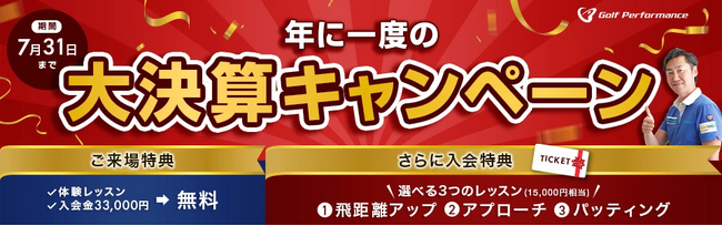 全国展開中の人気ゴルフレッスンスクール「ゴルフパフォーマンス」にて、年に一度の大決算キャンペーンを実施中!