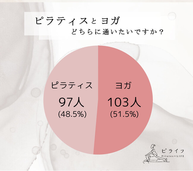 200人に質問したところ、ヨガが103人(51.5%)、ピラティスが97人(48.5%)と、約半分ずつの結果となりました。