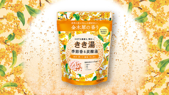 株式会社バスクリン(本社:東京都千代田区 社長:三枚堂正悟)は、炭酸入浴剤「きき湯」シリーズより、季節の変わり目などのゆらぎ*¹に寄り添う企画品「きき湯 季節香る炭酸湯 金木犀の香り」を7月22日(火曜日)に数量限定で発売いたします。温浴効果を高めて血行促進し、季節の変わり目に感じやすい疲労感や肩こり、腰痛、冷えなどを和らげます。ふんわりと甘く懐かしい金木犀の香りが広がり、気分もほぐれる心地よいバスタイムを演出します。