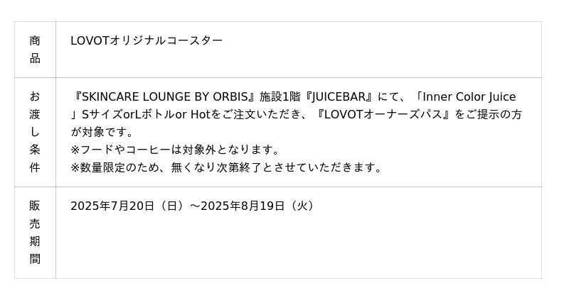 『SKINCARE LOUNGE BY ORBIS』1階の『JUICEBAR』にて、対象ドリンクをご購入のうえ『LOVOTオーナーズパス』をご提示いただいた方に、イベント限定デザインのペーパーコースターをプレゼントいたします。『LOVOTオーナーズパス』とは、LOVOTアプリ内に表示されるバーチャルカードで、LOVOTのオーナー様およびそのご家族様限定の特典を受け取ることができるパスポートです。LOVOTオーナー様ならではの特典を、ぜひお楽しみください。