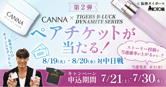 「歳をとるって進化だ」をコンセプトにCBDスキンケアCANNA(カンナ)を展開する株式会社アッツ(所在地:大阪市北区、代表取締役:山崎 晶久)は、阪神タイガースとのスペシャルキャンペーンを、2025年7月21日(月)より期間限定で展開いたします。公式Instagram・Xをフォロー&いいね&コメントでペア観戦チケットが当たる他限定オリジナルジャージなどが当たります。