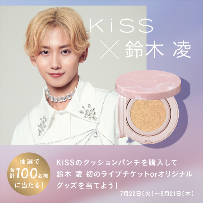 本キャンペーンでは、期間中に「キス クッションパンチ」をご購入いただいた方の中から抽選で100名様に、鈴木 凌さんの特典付きライブチケットや、ここでしか手に入らないオリジナルグッズが当たる豪華なマストバイキャンペーンを展開。さらに、応募者全員にKiSS×鈴木 凌さんのオリジナル壁紙画像をプレゼントするWチャンスもご用意しています。