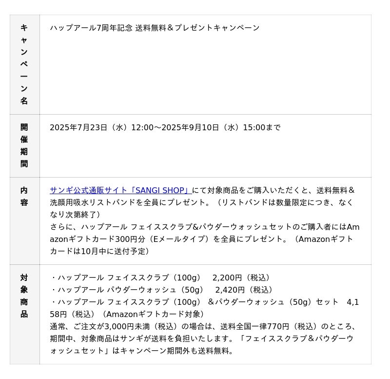 美白高機能歯みがき剤*1「アパガード」の開発・発売元である株式会社サンギ(本社:東京都中央区築地、代表取締役社長:ロズリン・ヘイマン)のスキンケアブランド「HAP+R(ハップアール)」が、今年で誕生7周年を迎えます。これを記念し、日ごろのご愛顧への感謝を込めた送料無料&プレゼントキャンペーンをサンギ公式通販サイト「SANGI SHOP」限定で、7月23日(水)~2025年9月10日(水)15時まで実施いたします。さらに、2024年よりブランドのイメージキャラクターであるモデルで女優のモトーラ世理奈さんの新ビジュアルも同時に公開。7周年を迎えたハップアールの魅力を、より多くの方にお届けします。