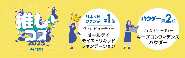 BRANDING PRODUCE COMPANYである株式会社Direct Tech(本社:東京都渋谷区、代表取締役社長:井上 信太郎、以下 Direct Tech)と、メイクアップ クリエイター“マリリン”との協働プロデュースコスメブランド『vim BEAUTY』(ヴィムビューティー)が、shop in(ショップイン)のスタッフが選んだ「推し!コス2025」にて、素肌をまとう錯覚ファンデーション「all day moist liquid foundation」(オールデイモイストリキッドファンデーション)が「リキッドファンデ部門第1位」、わずか54時間で10,000個完売した「keep confidence powder」(キープコンフィデンスパウダー)が「パウダー部門