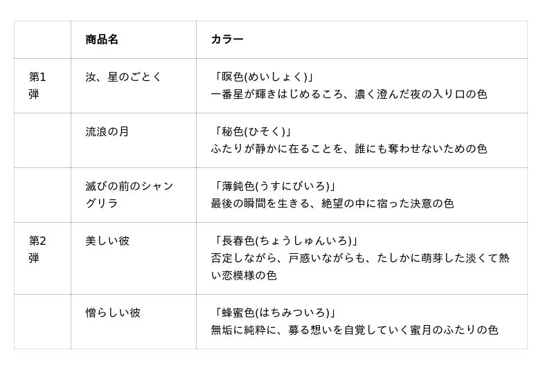 第2弾では『美しい彼』『憎らしい彼』をモチーフにした2色を、『美しい彼』コミカライズ版第6巻が発売される2026年2月頃に発売予定です。