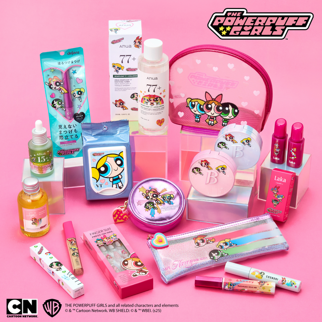 VTやAnuaなどのスキンケアアイテムから、BANILA CO、Lakaなどのメイクアイテム、&honeyやSign+などのヘアアイテムまで、さまざまなコスメが『パワーパフ ガールズ』デザインに大変身してお目見えします。さらに、ポーチや歯ブラシセットなど、コスメ雑貨もそろい、充実のラインアップです。