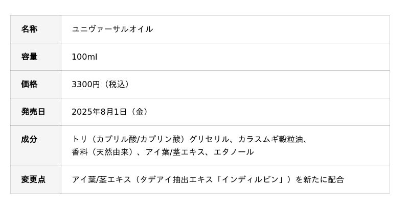 「ユニヴァーサルオイルLOPE」から「ユニヴァーサルオイル」へと名称を刷新し、シンプルで覚えやすく、より製品の本質を伝える名称になりました。