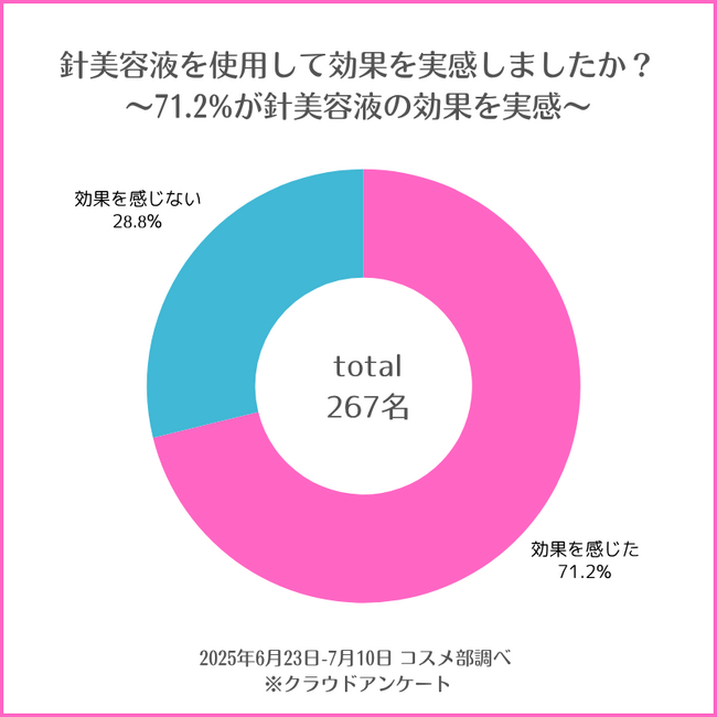 針美容液使用者267名のうち、71.2%(190人)が何らかの効果を実感していることが判明しました。