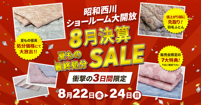 8月22日(金)~24日(日)の3日間、昭和西川の大阪ショールームにて「8月決算SALE」を開催します。まだまだ続く熱帯夜に嬉しい夏もの寝具も、決算のため処分価格にて大放出!また、注目「30年MuAtsu(ムアツ)」をはじめ、ネット限定モデルや秋冬の先行展示品まで、全商品を実際にお試しいただけます。