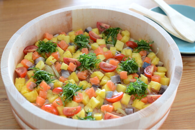 健康ごはん料理研究家・大和沙織さん直伝!「パイナップルちらし寿司」ポイント「パイナップルに含まれるビタミンCには抗酸化作用があり、<老化予防と美肌のビタミン>などと言われています。サーモンなどに含まれるビタミンEと一緒に摂ることで相乗効果が働き、抗酸化作用がより高まります。他にもビタミンCはコラーゲンの合成に必要不可欠なビタミンで、免疫力向上、鉄分の吸収促進、肌のシミの原因となるメラニン色素の生成を抑えるなど、様々な効果が期待できます。加熱に弱い栄養素なので、今回のように生で食べると効率よく摂取することができます。パイナップルのバランスの良い甘み・酸味が酢飯によく合います。酢飯はラップに包んで冷凍保存可!お好みでトッピングを変えて作ってみてください。」