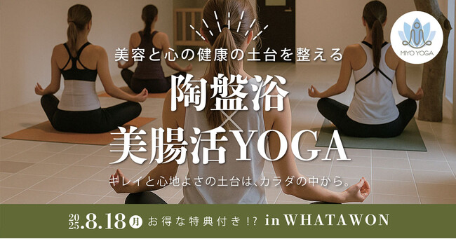 大阪・岸和田の滞在型エンターテインメントモール「WHATAWON(ワタワン)」にある〈京町湯屋SOKOTOTO〉にて、2025年8月18日(月)限定で、《陶盤浴 × 美腸活YOGA》の特別イベントを開催いたします。じんわり汗をかきながらストレス解消&内側からキレイに整えるヨガ体験。心と身体をリセットしたい方にぴったりの1日です。
