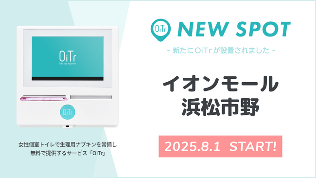 全国の商業施設や交通機関、公共施設、オフィス、学校などの女性個室トイレに、生理用ナプキンを常備・無料提供する日本初のサービス「OiTr(オイテル)」を展開するオイテル株式会社(本社:東京都新宿区、代表取締役:崎山 真)は、「トイレットペーパーのように、個室トイレに生理用品が行き届く社会」の実現を目指し、新たに「イオンモール浜松市野(静岡県浜松市)」にOiTrを設置し、2025年8月1日よりサービスを開始しましたことをお知らせいたします。