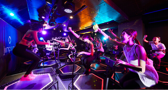 「jump one」は、2016年3月に日本初の暗闇トランポリン専門フィットネスとして東京・銀座に1号店をオープン。ランニングの1.7倍ともいわれるダイエット効果に加え、迫力のサウンドと煌びやかなライティングという非日常空間でのエクササイズは、ストレスが発散できるとして多くの女性から高い支持を得ています。
