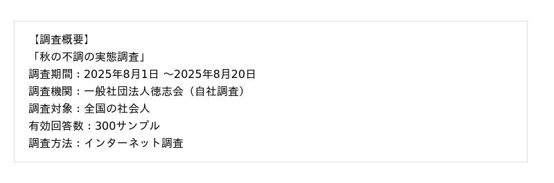 一般社団法人徳志会は、全国の社会人を対象に秋バテ・秋うつに関するアンケート調査を実施しました。