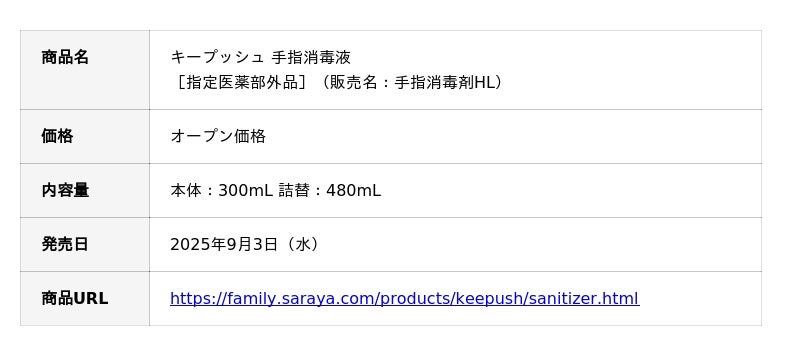 サラヤ株式会社(本社:大阪/代表取締役社長:更家悠介)は、持続する殺菌成分*でお出かけ前から清潔がつづく新発想の手指消毒液「キープッシュ 手指消毒液」を2025年9月3日(水)より、新発売することをお知らせいたします。