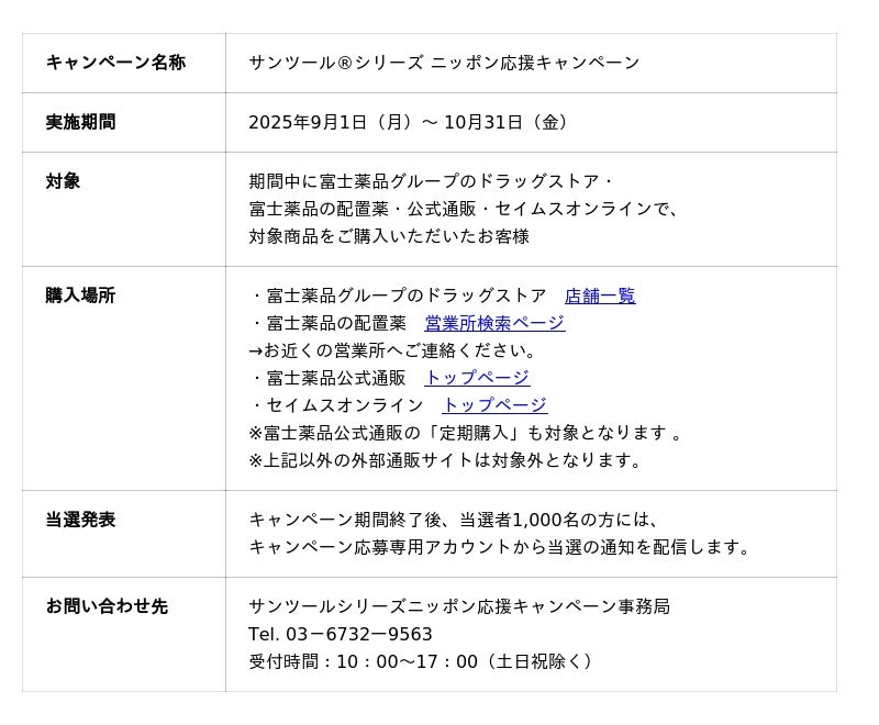医薬品の開発から製造・販売までを行う複合型医薬品企業の株式会社富士薬品(本社:埼玉県さいたま市 代表取締役社長:高柳 昌幸、以下「富士薬品」)は、2025年9月1日(月)から10月31日(金)までの間、「サンツール(R)シリーズ ニッポン応援キャンペーン」を開催します。