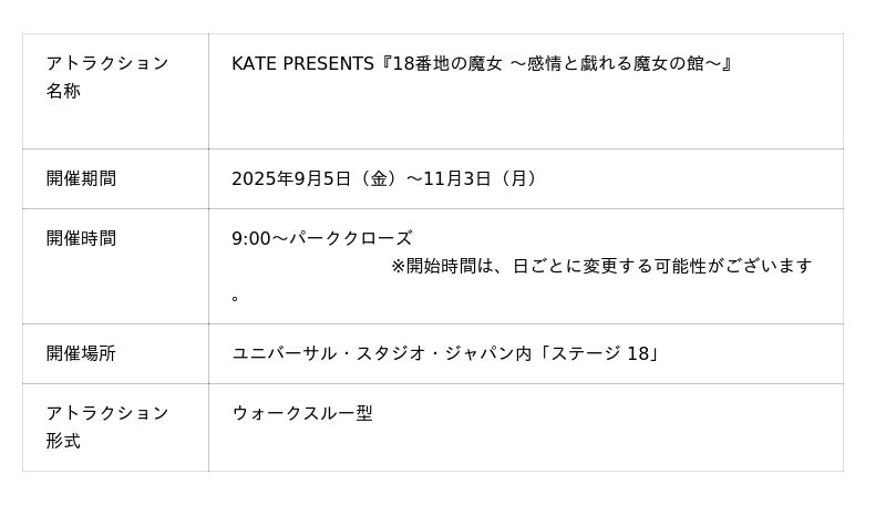 グローバルメイクアップブランド『KATE(ケイト)』は、2025年9月5日(金)から11月3日(月)の期間限定で開催する、ユニバーサル・スタジオ・ジャパンが主催するイベント『ハロウィーン・ホラー・ナイト』にて、同パークと共創したアトラクション、KATE PRESENTS『18番地の魔女 ~感情と戯れる魔女の館~』をオープンいたします。