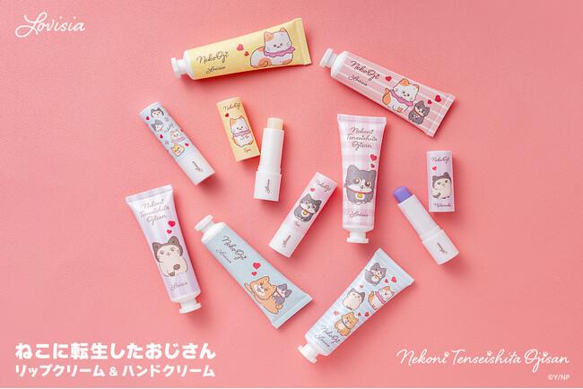 『Lovisia ねこに転生したおじさん リップクリーム』(全4種) と『Lovisia ねこに転生したおじさん ハンドクリーム』(全6種)は9月18日(木)より10:00よりLovisiaオンラインショップで販売を開始いたします。また同日より全国のバラエティショップで順次販売いたします。