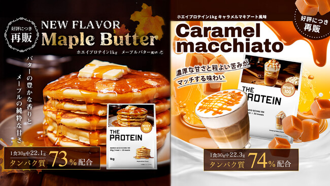 このたびTHE PROTEINホエイプロテインで人気を集めた〈キャラメルマキアート風味〉と〈メープルバター風味〉が、多くの再販希望の声にお応えして待望の復活を果たしました!