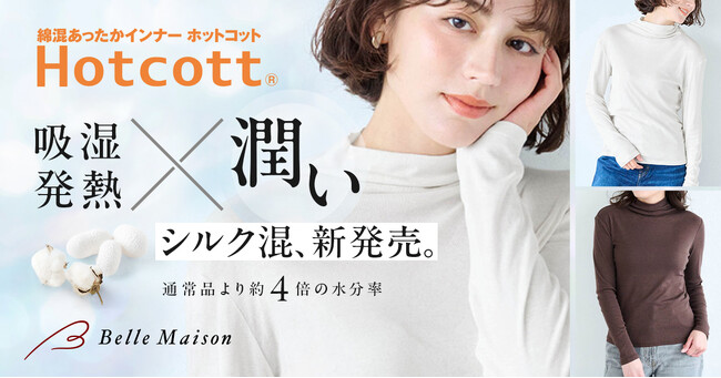 株式会社千趣会(本社:大阪市 代表取締役社長:鈴木聡 以下千趣会)の通販事業ベルメゾンは、人気の綿混あったかインナー「Hotcott(ホットコット)(R)」シリーズにおいて、通常品※1と比べ約4倍の水分率も持つ生地を開発し、うるおいを追求した「シルク混ホットコット」を2025年9月16日(火)からベルメゾンネットにて販売開始します。また、昨年初登場し好評の綿100%「ふんわりコットン」シリーズは、シアー素材など素材にこだわった新商品を揃え、「きこまぬコットン」シリーズとして拡大展開します。