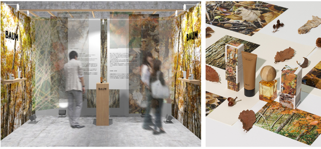 テーマは「BAUM OAK FOREST – 香りを巡るオークの森の循環」。岩手県に位置する「BAUMオークの森」*からインスピレーションを受けた、今秋の限定香調「オークフォレスト」の香りとともに、パッケージデザインでコラボレーションをした山岳収集家、鈴木優香さんが捉えたBAUMの森の景色の一片‐紅く染まった木々の葉、豊かな土壌をつくる落ち葉やどんぐり‐など、まるで森に足を踏み入れたような気持ちで森の美しい循環をご体験いただけます。