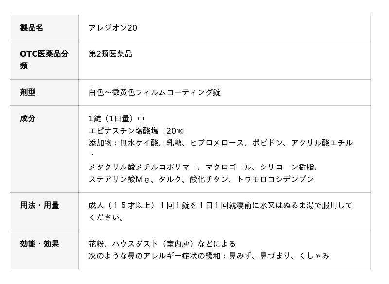 「アレジオン20」(第2類医薬品)は、持続性有効成分エピナスチン塩酸塩を20mg配合したアレルギー専用鼻炎薬です。第2世代の抗ヒスタミン薬で、眠くなりにくい※という大きな特徴を持っているほか、1日1回1錠の服用で手間をかけずに鼻炎症状のケアを行うことができます。
