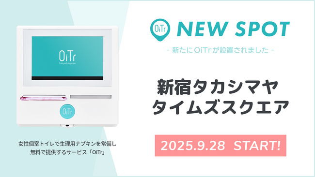 全国の商業施設や交通機関、公共施設、オフィス、学校などの女性個室トイレに、生理用ナプキンを常備・無料提供する日本初のサービス「OiTr(オイテル)」を展開するオイテル株式会社(本社:東京都新宿区、代表取締役:崎山 真)は、「トイレットペーパーのように、個室トイレに生理用品が行き届く社会」の実現を目指し、新たに東京都スマートサービス実装促進プロジェクト「Be Smart Tokyo」の取り組みとして、東京都内の人気商業施設「新宿タカシマヤ タイムズスクエア(東京都渋谷区)」にOiTrを設置し、2025年9月28日よりサービスを開始しましたことをお知らせいたします。