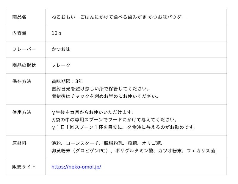 今回発売する「かつお味パウダー」は、猫の好きな味で“食べムラ解消”と“お口ケア”を両立させた新しい歯みがき習慣を提案する製品です。
