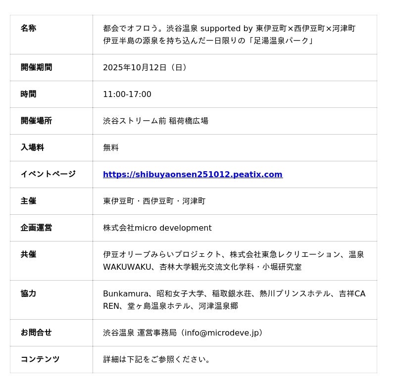 株式会社micro development(本社:静岡県賀茂郡東伊豆町、代表取締役社長:守屋真一、以下「mdi」)は、2025年10月12日(日)渋谷ストリーム前「稲荷橋広場」にて、伊豆半島の源泉を持ち込んだ「足湯温泉パーク」を出現させます。都会で暮らす方々に、秋の休日に日頃の疲れを癒す、オフなひとときを提供します。