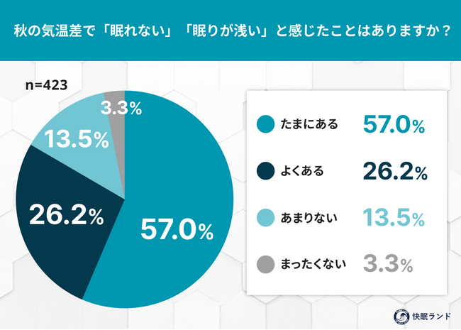 気温の寒暖差が大きくなる秋。朝晩の冷え込みや日中の暑さによって体調を崩す人が増える季節です。快眠グッズ紹介サイト「快眠ランド」を運営する「ムーンムーン株式会社」では、全国の20代~60代の男女423名を対象に「秋の体調と睡眠に関する実態調査」を実施しました。その結果、約8割(83.2%)が“寒暖差によって眠れない・眠りが浅いと感じたことがある” と回答し、多くの人が秋の気温差による睡眠トラブルを実感していることがわかりました。